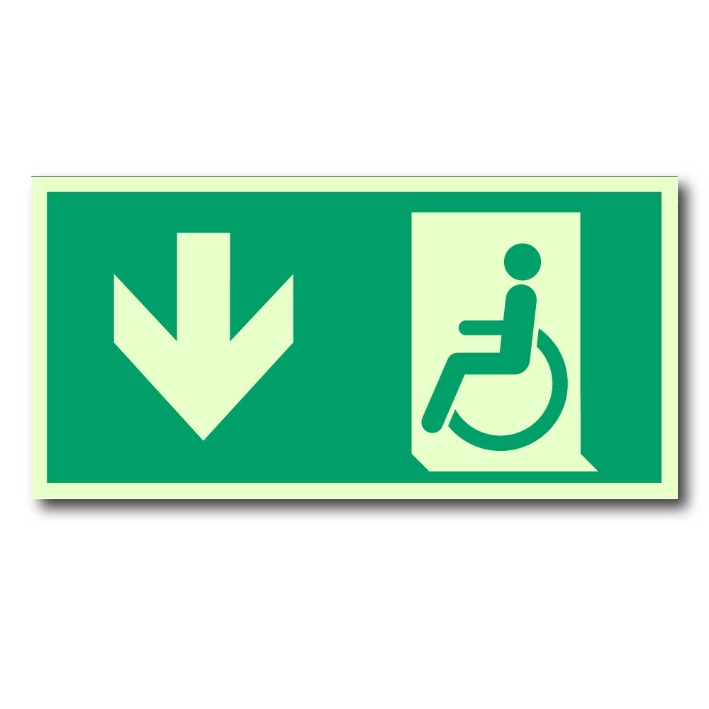 Etterlysende nødutgangsskilt – pil ned for handikap rømningsvei er en essensiell komponent i sikkerhetsplanen for enhver bygning, skip eller plattform samt andre transportmidler av str. Skiltene sikrer at rømningsveier er tydelig merket, selv i tilfelle strømutfall, og bidrar til trygg evakuering under nødsituasjoner. Våre skilt er utformet i henhold til Norsk Standard 3926, ISO 7010 og DIN 6751, noe som garanterer høy kvalitet og etterlevelse av gjeldende lover og forskrifter.