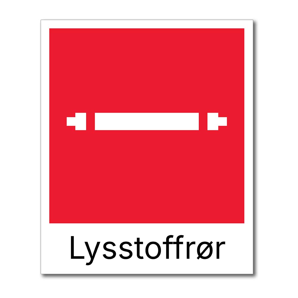Skiltet har en rød bakgrunn med et ikon av et lysstoffrør, som gjør det enkelt å forstå hvilken type avfall som skal plasseres her. Teksten “Lysstoffrør” er skrevet i store, lettleste bokstaver (på enkelte varianter). Designet er intuitivt og klart, slik at brukere enkelt kan identifisere riktig sted for innsamling av lysstoffrør. Skiltet er redigerbart på tekst så man også kan tilpasse skiltet for flerspråklige miljøer.