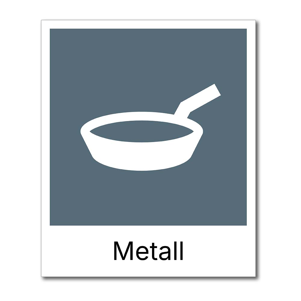 Skiltet har en karakteristisk grå eller sølvfarget bakgrunn, som raskt assosieres med metall. Det er dekorert med et tydelig ikon av en metallpanne, kombinert med teksten “Metall” i store, lettleste bokstaver. Dette enkle og effektive designet gjør det enkelt å identifisere riktig avfallsbeholder for metallavfall, selv på avstand. Skiltet er redigerbart på tekst så man også kan tilpasse skiltet for flerspråklige miljøer.