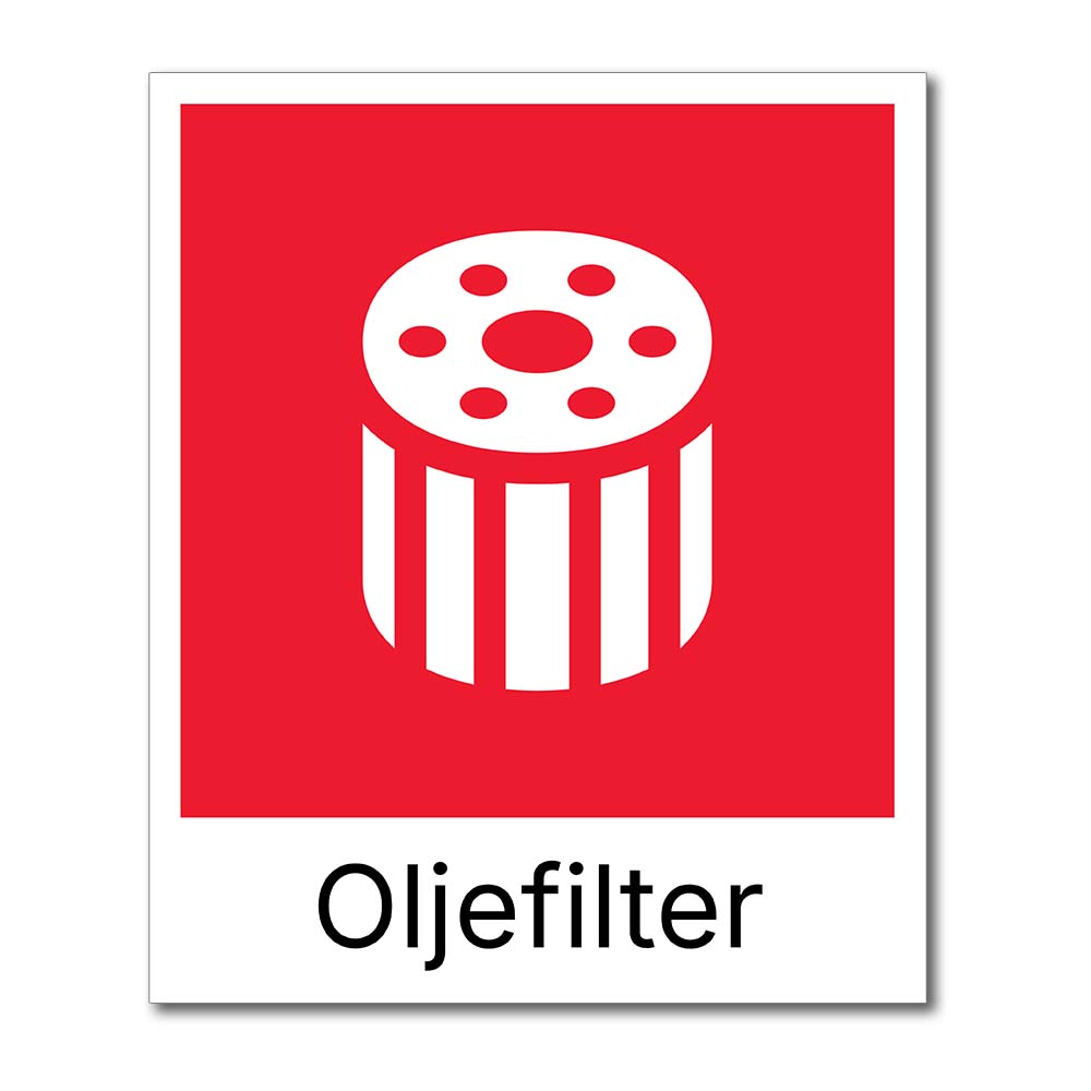 Skiltet har en rød bakgrunn med et ikon av et oljefilter for enkel identifikasjon. Teksten “Oljefilter” er skrevet i store, lettleste bokstaver (på enkelte varianter), noe som gjør det enkelt å identifisere riktig innsamlingssted for brukte oljefiltre. Designet er intuitivt og lett forståelig for brukerne. Skiltet er redigerbart på tekst så man også kan tilpasse skiltet for flerspråklige miljøer.