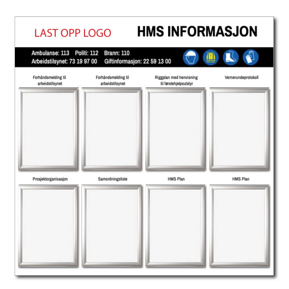 Hva er HMS Tavle med 8 stk klipsrammer?