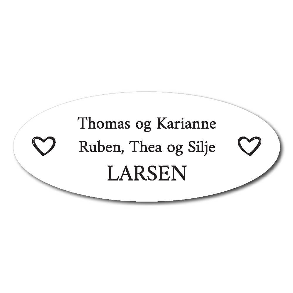 Gjør postkassen din unik med vårt graverte postkasseskilt i et elegant, ovalt format. Dette skiltet er den perfekte måten å sikre at posten kommer frem til riktig mottaker, samtidig som det gir inngangspartiet et mer personlig og ryddig preg. Skiltet en tydelig oversikt over alle som hører til i husstanden.