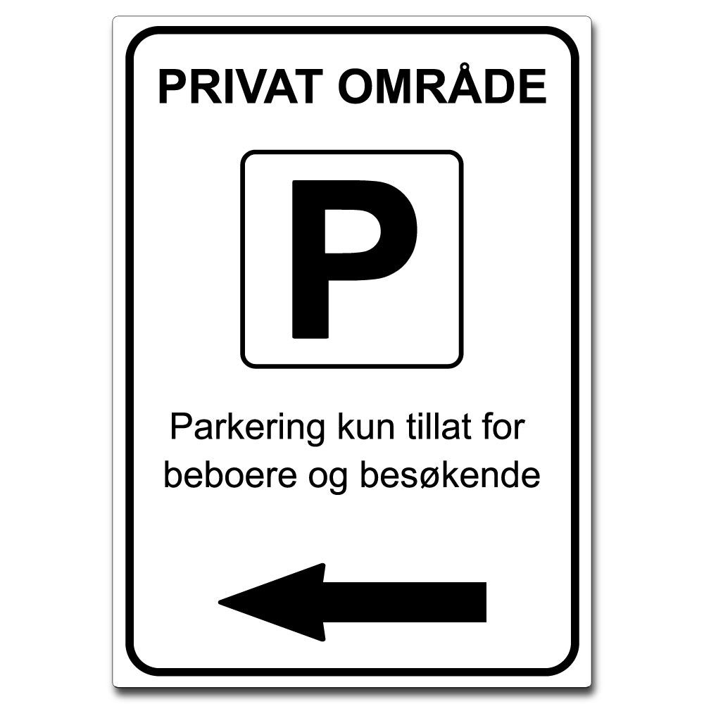 Sørg for tydelig informasjon med vårt skilt for privat område. Med pil til venstre viser det klart at parkering kun er for beboere og deres gjester. En enkel løsning for å opprettholde orden og sikkerhet!
