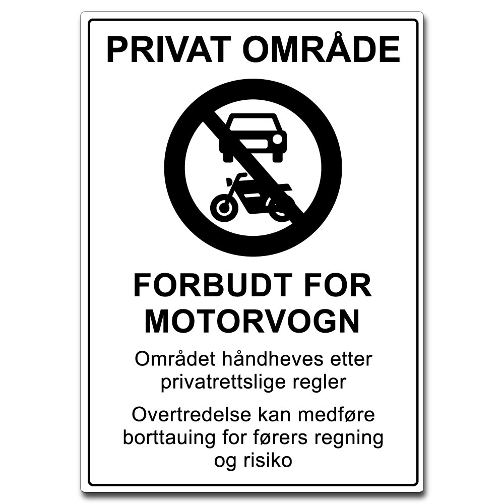 Skiltet «Privat område skilt – Forbudt for motovogn – Hvit» viser tydelig at kjøretøy på området er forbudt, og at overtredelser kan føre til håndheving og risiko for borttauing. Tekst kombinert med symbol gir kjørende en klar forståelse av gjeldende regler og bidrar til å opprettholde ro og sikkerhet i området.