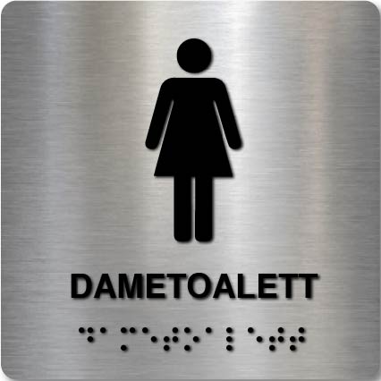 Merk dametoalettet tydelig med vårt taktile skilt, spesialdesignet for enkel navigasjon og universell tilgjengelighet. Skiltet er tilgjengelig i både en variant med braille (punktskrift) og en uten braille, og kombinerer opphevede symboler og tekst for maksimal lesbarhet. Ifølge byggteknisk forskrift TEK17 er universell utforming et krav i bygninger hvor publikum har adgang. Dette innebærer at skilter skal ha både taktile og visuelle elementer, og i mange tilfeller også braille, for å være tilgjengelige for personer med funksjonsnedsettelser. Les mer om kravene til universell utforming på TEK17 på Direktoratet for byggkvalitet.