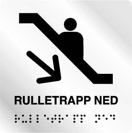 Sørg for tydelig og universell skilting for rulletrapper med vårt taktile skilt. Dette skiltet, med ikon som tydelig indikerer rulletrapp nedover, er ideelt for å sikre enkel orientering i bygninger. Tilgjengelig i både en variant med braille (punktskrift) og en uten braille, oppfyller dette skiltet kravene til universell utforming. Ifølge byggteknisk forskrift TEK17 er universell utforming et krav i bygninger hvor publikum har adgang. Dette innebærer at skilter skal ha både taktile og visuelle elementer, og i mange tilfeller også braille, for å være tilgjengelige for personer med funksjonsnedsettelser. Les mer om kravene til universell utforming på TEK17 på Direktoratet for byggkvalitet.