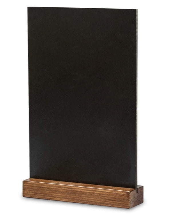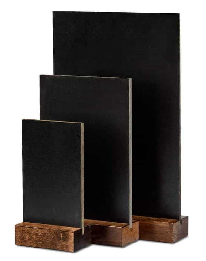 Borddisplayets fot i beiset treverk gir umiddelbart et varmt og naturlig preg. Dette ikke bare løfter frem din melding, men gir også en følelse av kvalitet og håndverk. Hvert display er unikt, med den varme tonen av beiset tre som legger til en rustikk og tidløs karakter. Dette er også et økovennlig skiltprodukt