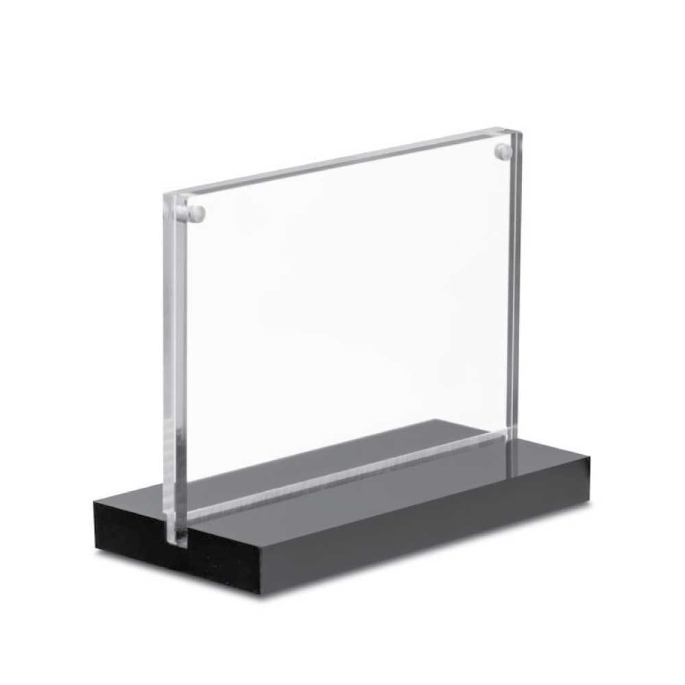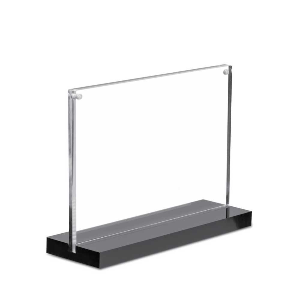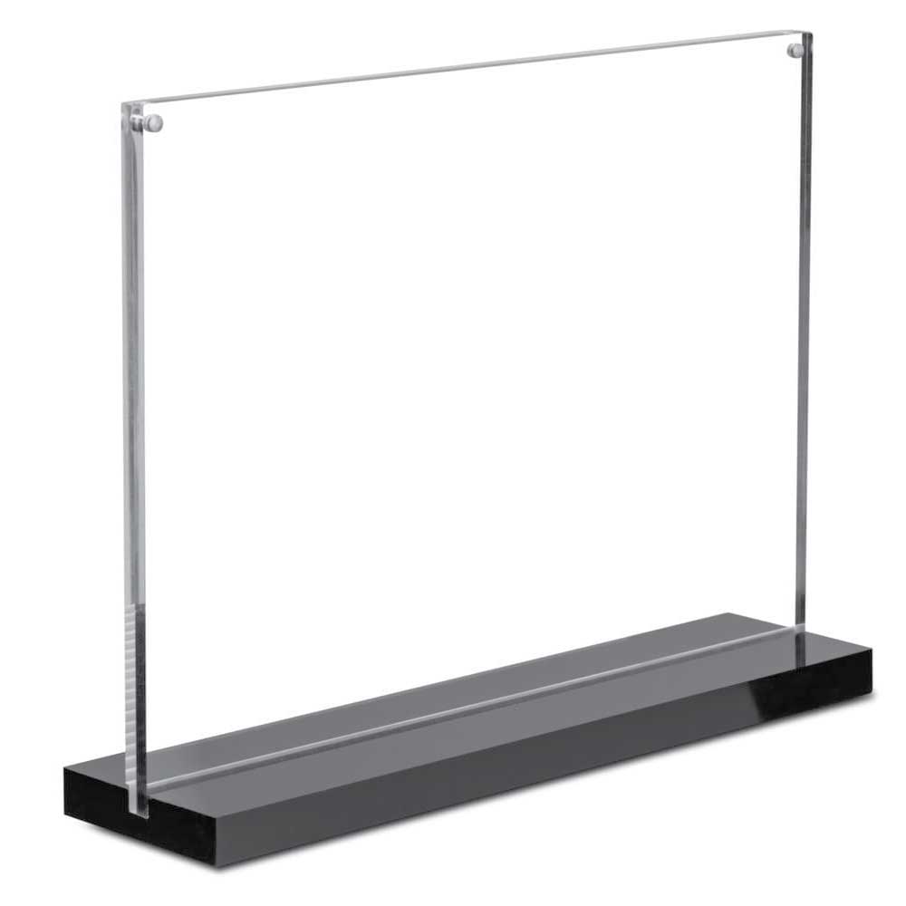 Vista bord display med magnetisk akryl er tn elegant dobbeltsidig plexi bord display med god stabilitet takket være den brede basefoten. Trykket setter du enkelt inn med å legge et ark mellom de to plexiglassplatene med magnetisk lås i toppen.
